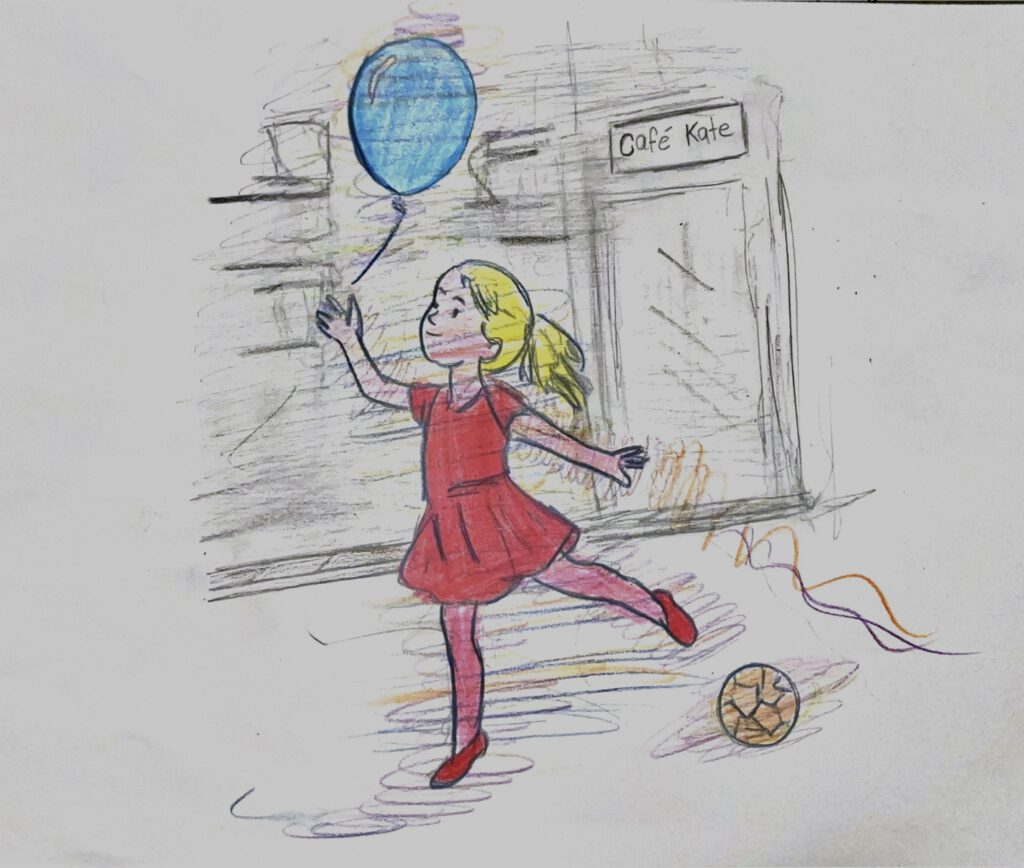 Heute komme ich nicht dazu, mein Tiramisu aufzuessen. Die kleine Tänzerin spielt mit einem blauen Luftballon. Sie hat auch Talent zur Fußballerin und zur Akrobatin. Mir bringt sie jetzt Werfen, Fangen, Kopfball und Jonglieren mit dem Finger bei.