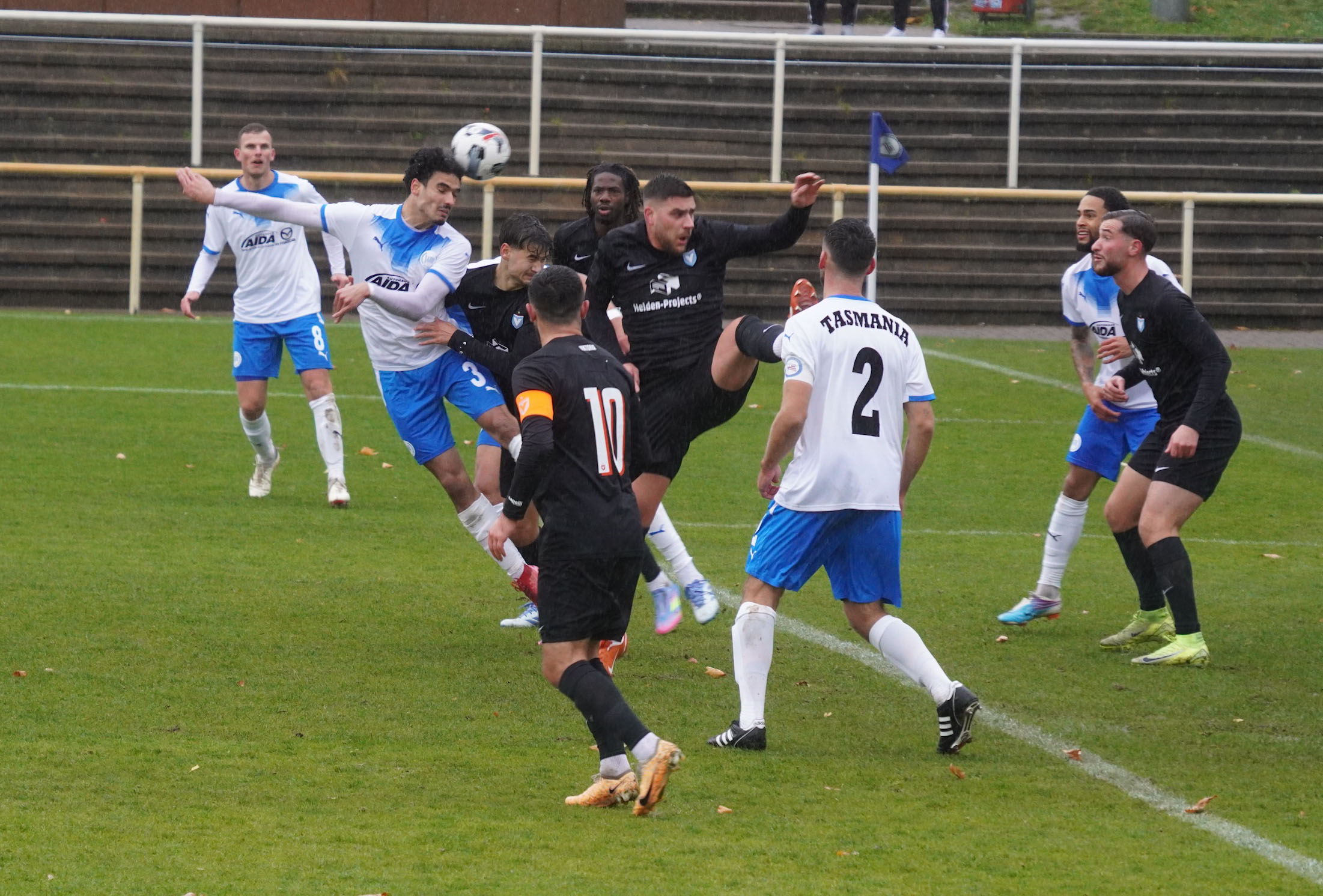 Getümmel vor dem Tor. Tasmania in weiß gegen Viktoria. Foto: Hagen Nickelé